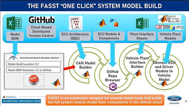 Ford Automated System Simulation Toolchain (FASST) is a full-vehicle simulation toolchain for ‘distributed’ chassis controls and DAT features used for feature development and verification. FASST is a modern verification method/toolchain that enables Ford engineers to implement continuous integration within their Model-Based Design process.