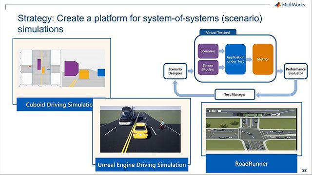 A promising method to overcome this matter is the scenario-based approach, focused on the critical situations represented by a significant sample of harmonized scenarios. Since confronting conventional physical driving tests with this test effort is not feasible anymore, virtualization of testing methods by means of computer simulation must be adopted. To supply a future certification process of automated driving systems, TÜV SÜD is developing a methodology for a scenario-based evaluation of AD systems that combines a virtual-based approach and physical testing while guaranteeing repeatability of test conditions. Physical testing provides real-world data used for parametrization and validation of the simulation models. In this presentation, these models will be introduced as well as the overall architecture of the simulation toolchain, which is strongly based in MATLAB® and Simulink®. Other automated, driving-related tools from MathWorks are utilized as well. The workflow within this testing methodology for a specific ODD will be demonstrated.