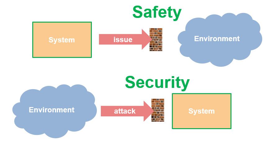 下图直观的展示了两者的区别,功能安全问题侧重系统本身发生故障导致对环境(包括人身)产生的危害;信息安全问题侧重系统存在漏洞导致对外界攻击的防御能力下降。对于高完整性系统而言,功能安全往往会首要考虑,再依据与外界交互的特点引入信息安全考量。