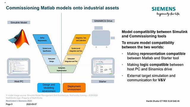 Siemens uses Simulink® to model and simulate several processes in a typical industrial plant scenario to evaluate control and process timings and tuning. However, they use engineering and commissioning tools that integrate with the process communication in order to deploy and tune with the plant dynamics. This approach restricts the design tools such as Simulink to perform parameter sweeps and optimization and in general breaks the model-based development philosophy.