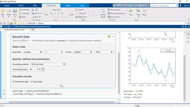Live Editor tasks are simple point-and-click interfaces that you can add directly to your script to perform a specific set of operations. These tasks can be configured interactively to iterate through different settings and identify the optimal configuration for your application. As with the Data Cleaner app, you can also automatically generate MATLAB code to reproduce your work.