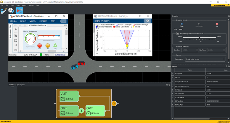 Automated Driving ToolboxではEuro ECAPシナリオのパターンをあらかじめ準備しています。シナリオの条件やパラメータ、車種等のバリエーションを変更可能な拡張性も有しています。実車で実施できる試験数には限りがありますが、シミュレーションでは再現性のあるより多くの試験を実施できます。Euro NCAPで規定されるシナリオに加え、ユーザーは許容誤差や独自のパラメータ設定を組み合わせたシナリオも手早く準備することができ、開発したシステムのロバスト性を机上で効率よく検証できます。