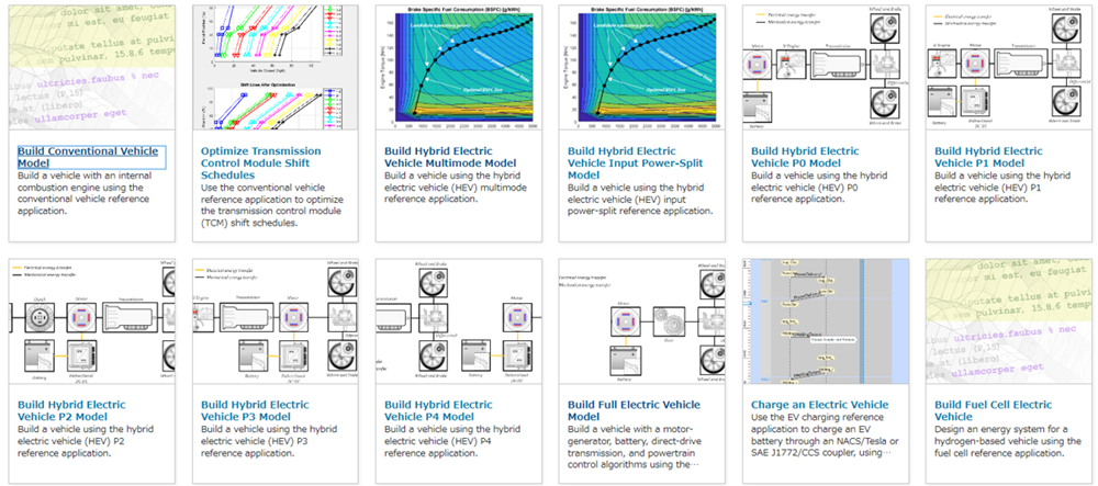 クローズドループなシミュレーションを行うためには車両モデルも必須になります。一方で車両モデルの準備に悩まれるケースも多く見られます。単純なモデルから詳細なモデルまでシミュレーションの用途に応じて求められる表現度も異なります。Vehicle Dynamics Blockset™を組み合わせることで、二輪で表現した簡易的な車両モデルから6自由度の詳細な車両モデルまでを表現できます。リファレンスとなる車両モデルも提供しており、シミュレーションに必要な車両モデルをすぐに準備できます。システムの初期検討では簡易的なモデルを使うことで手早く環境を準備できますし、詳細な車両モデルを使った場合は車両ダイナミクスが及ぼすセンサ検出への影響も考慮することができまます。提供するリファレンスモデルは中身を詳細にカスタマイズすることも可能です。Powertrain Blocksetではエンジン、トラクションモーター、バッテリー、トランスミッション、タイヤ等のコンポーネントライブラリを提供しています。車両のパワートレインに関する構成やパラメータを変更することができ、車両重量やブレーキ性能の違いを考慮したバリエーションをシミュレーションすることも可能です。