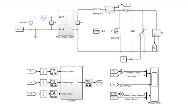 Modeling power factor correction for a continuous conduction mode (CCM) boost converter in Simscape Electrical (see example).