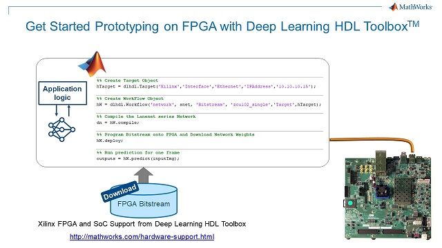 Deep Learning HDL Toolbox Support Package for AMD® FPGA and SoC devices enables you to deploy a deep learning processor on FPGA-based hardware from MATLAB.
