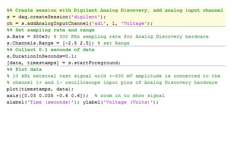 Data Acquisition Toolbox Support Package for Digilent Analog Discovery hardware lets you perform the following tasks in MATLAB: