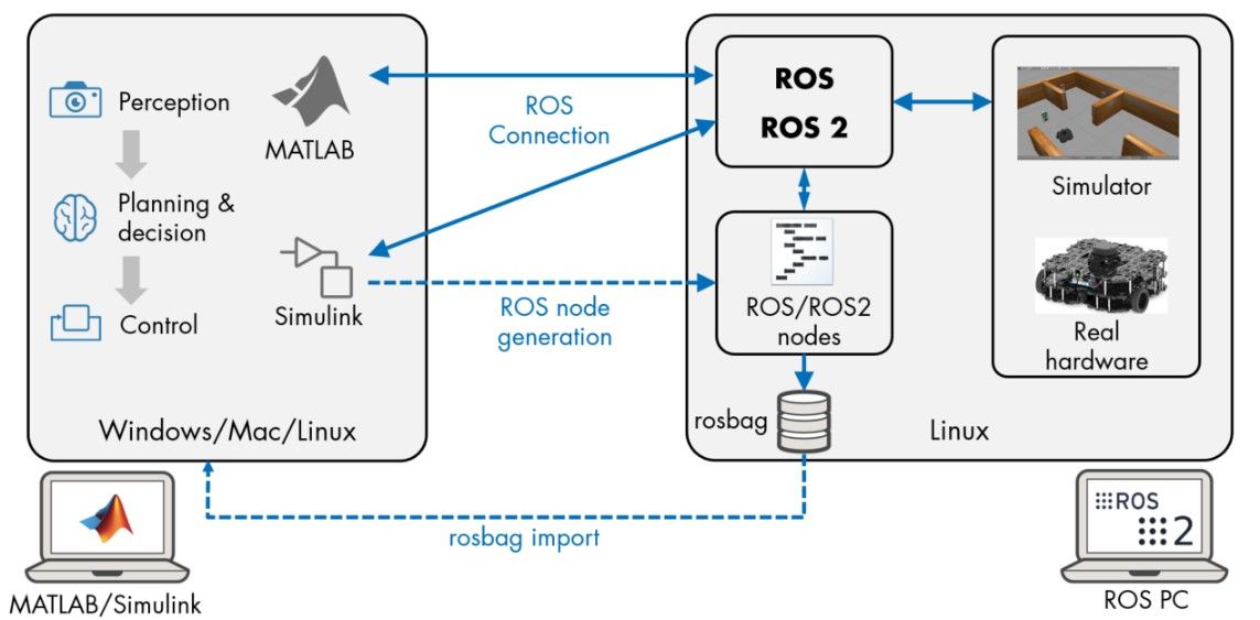 ROS Toolbox provides an interface between MATLAB and Simulink and the Robot Operating System (ROS) that enables you to communicate with a ROS and ROS 2 network, interactively explore robot capabilities, and visualize sensor data. You can develop, test, and verify your robotics algorithms and applications on ROS-enabled robots and robot simulators such as Gazebo. You can also create a self-contained ROS network directly in MATLAB and Simulink, and import ROS log files (rosbags) to visualize, analyze, and post-process logged data. For example, you can read a batch of images for labeling and training a neural network. These features allow you to develop your robotics algorithms in MATLAB and Simulink, while giving you the ability to exchange messages with other nodes on the ROS network. The toolbox also supports a large set of existing message types. Using the ROS custom messages generation function, you can extend this set to include custom message types. You can define your own custom ROS and ROS 2 message and service types, and use them in MATLAB and Simulink to communicate with other nodes in the ROS network. You can share generated custom message interfaces with other MATLAB users. With Simulink Coder, you can generate C++ code from a Simulink model for a standalone ROS application that can run on any Linux® platform such as Raspberry Pi that has ROS installed.