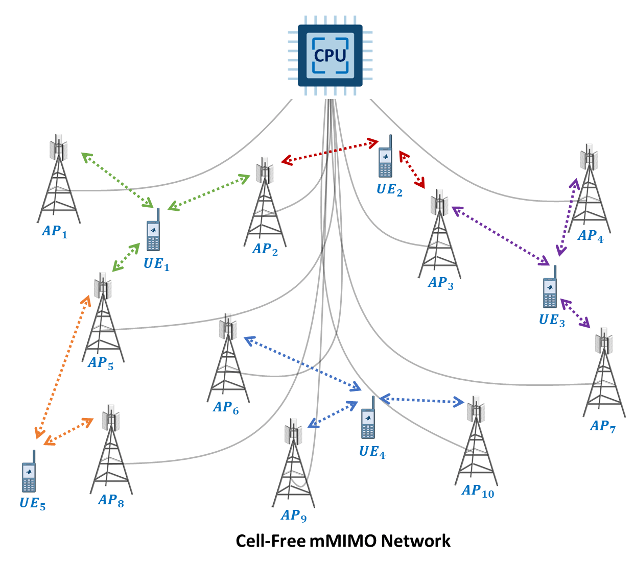 A CF mMIMO network consists of numerous geographically distributed access points (APs) that jointly serve user equipment (UE) nodes, as illustrated in this figure. A central processing unit (CPU) controls all APs, performing resource allocation and scheduling. A fronthaul connection, with assumed unlimited capacity, negligible latency, and error-free transmission, links the APs to the CPU. UE nodes can wirelessly connect to multiple APs and decode the combined signal from the connected APs.