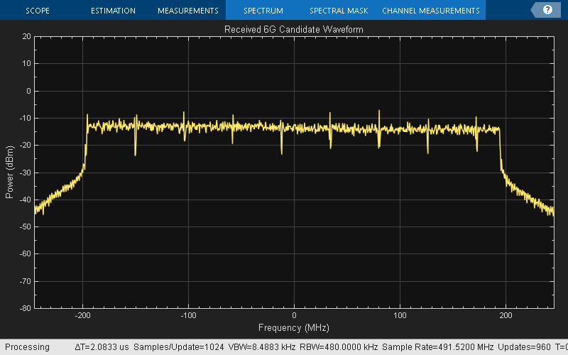 This example shows how to generate, transmit, capture, and analyze a large-bandwidth 6G candidate waveform. It uses an NI™ USRP™ X410 software-defined radio (SDR) to transmit the waveform and capture it. The example then measures the error vector magnitude (EVM) of the captured waveform.