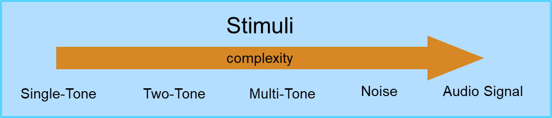 The response shows both harmonic distortion and interharmonic distortion across the entire spectrum robustly--without need for careful selection of the excited frequencies. The result, "multi-tone distortion", doesn't show the generation process in detail. Multi-tone stimulus is a good tool for quality control because it is fast, it is a realistic exercise of the audio device, and it covers the entire spectrum.
