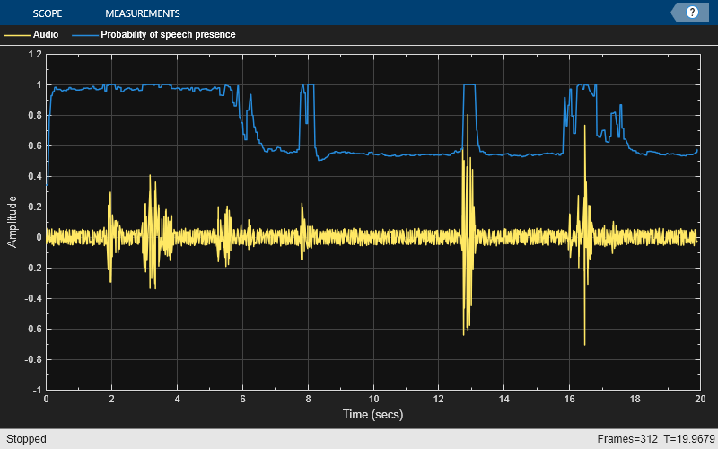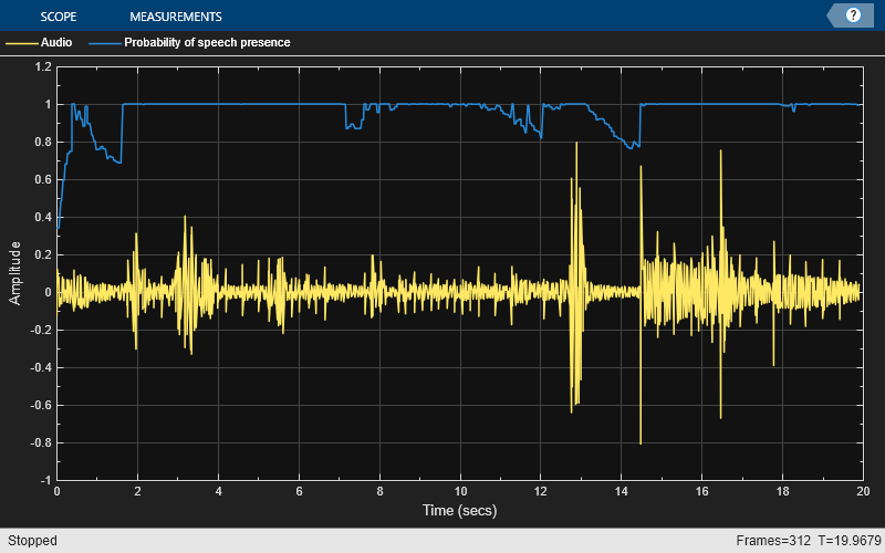 fileReader = dsp.AudioFileReader("vadexample-noisyspeech.ogg"); vad = voiceActivityDetector(); scope = timescope( ... NumInputPorts=2, ... SampleRate=fileReader.SampleRate, ... TimeSpanSource="Property",TimeSpan=20, ... BufferLength=20*fileReader.SampleRate, ... YLimits=[-1 1.2], ... ShowLegend=true, ... ChannelNames=["Audio","Probability of speech presence"]); device = audiostreamer(SampleRate=fileReader.SampleRate); while ~isDone(fileReader) x = fileReader(); probability = vad(x); scope(x,probability*ones(fileReader.SamplesPerFrame,1)) drawnow limitrate play(device,x); end release(fileReader) release(vad) release(device) release(scope)