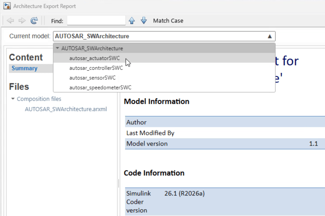 In the architecture export report, you can navigate to code generated for each of the component models. For example, to view code for the model autosar_actuatorSWC, select it from the Current model list.