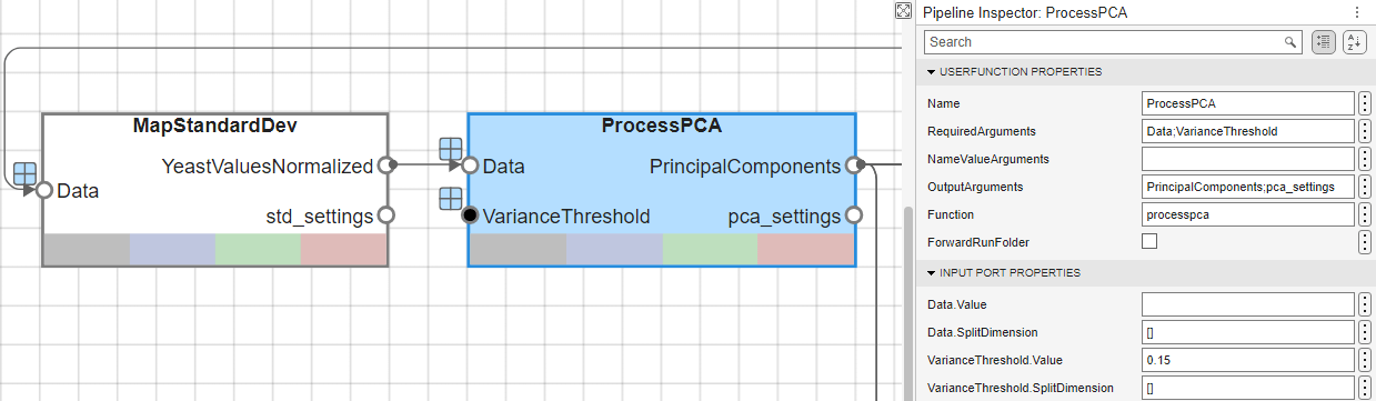 Similar to the filtering blocks above, these two blocks, MapStandardDev and ProcessPCA, are UserFunction blocks that call mapstd and processpca.