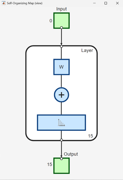 The UserFunction block ViewSOM calls the view function on the generated SOM for an overview of the network's architecture.