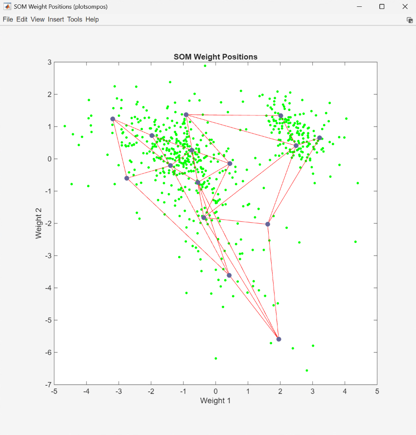 The UserFunction block PlotSOMWeightPos uses the plotsompos function to display the derived network over a scatter plot of the first two dimensions of the data.