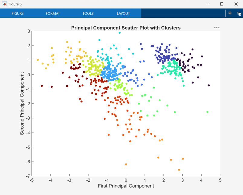 Visualize the principal components using the scatter function, specified in the UserFunction block PlotPCA, which generates the following figure: