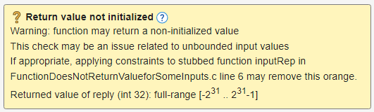 See if you can trace the orange check to a Polyspace assumption that occurs earlier in the code. If the assumption does not hold true in your case, add a comment or justification in your result or code. See Address Polyspace Results Through Bug Fixes or Justifications or Address Results in Polyspace Access Through Bug Fixes or Justifications (Polyspace Access).