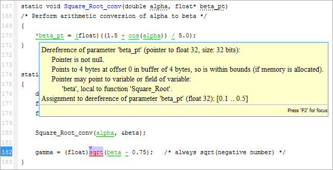 Place your cursor over a check to view range information for variables, operands, function parameters, and return values.