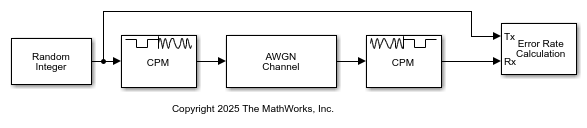 The cm_cpm_demod model passes a CPM-modulated signal through AWGN, demodulates the signal, and then computes the error rate of the received bits.