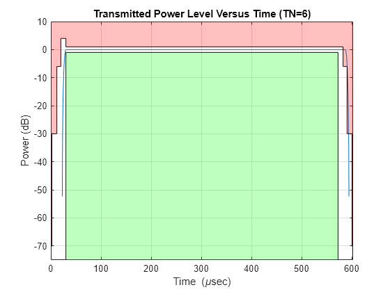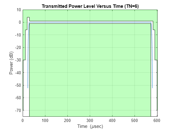 Figure contains an axes object. The axes object with title Transmitted Power Level Versus Time (TN=6), xlabel Time ( mu sec), ylabel Power (dB) contains 5 objects of type line, patch.