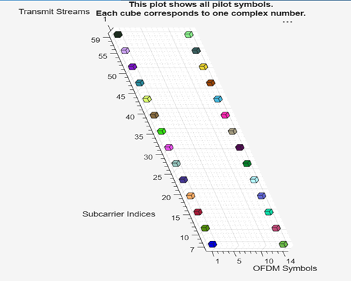 pilotcfg = ofdmPilotConfig with properties: FFTLength: 64 NumGuardBandCarriers: [2×1 double] NumSymbols: 14 NumTransmitStreams: 2 StreamGroups: {[1 2]} PilotLocations: {[2×2×52 double]} PilotSymbols: {[2×2×52 double]}StreamGroups: {[1 2]}value shows that both streams are grouped together. At each pilot location, both streams transmit pilot symbols at the same time and frequency, but with different orthogonal values.PilotLocations: {[2-by-2-by-52 double]}is a 3-D array showing the placement of pilot symbols. First dimension is the number pilot locations per cluster. Each location is a [subcarrier;symbol} pair. Second dimension is always 2 representing a two-element coordinate where one coordinate is the subcarrier index and the other coordinate is OFDM the symbol index. Third dimension is the number of clusters.PilotSymbols: 2-by-2-by-52 doubleis a 3-D array of the actual pilot values. First dimension is the number of pilot symbols per cluster. Second dimension is the number of streams per group. Third dimension is the number of clusters. Each cluster has a 2-by-2 matrix of complex pilot values. Each column corresponds to a stream, and each row to a pilot in the cluster. These are chosen so that, in each cluster, the pilots sent by the two streams are orthogonal.
