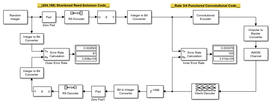 In the model, remove the delay block between the Viterbi Decoder block and the Bit-to-Integer Convertor block. Removing the delay block causes the misalignment between the words and the frames that contain them. Consequently, this misalignment leads to a significant increase in the error rate and the number of errors reported by the Outer Error Rate block.