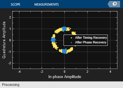Open the script to create a writable copy of this example and its supporting files. Then, to show the effects of the recovery algorithms, you can enable and disable the logical control variables recoverTimingPhase and recoverCarrier and rerun the simulation.