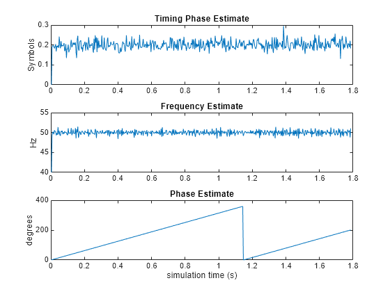 At the end of the simulation, the example displays the timing phase, frequency, and phase estimates as a function of simulation time.