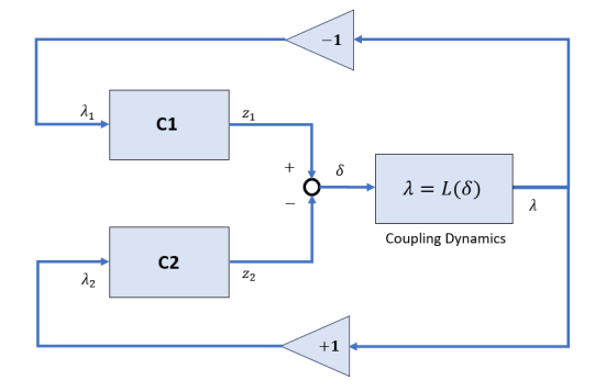 In general, you can represent physical couplings in a block diagram form as shown in the following figure. The coupling is characterized by the "Coupling Dynamics" block mapping (collocation gap) to the internal forces . Here, and denote the positions on each part of the nodes being coupled together.