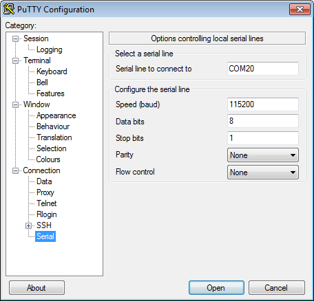 Open a serial connection to the device using a terminal software, such as PuTTy: