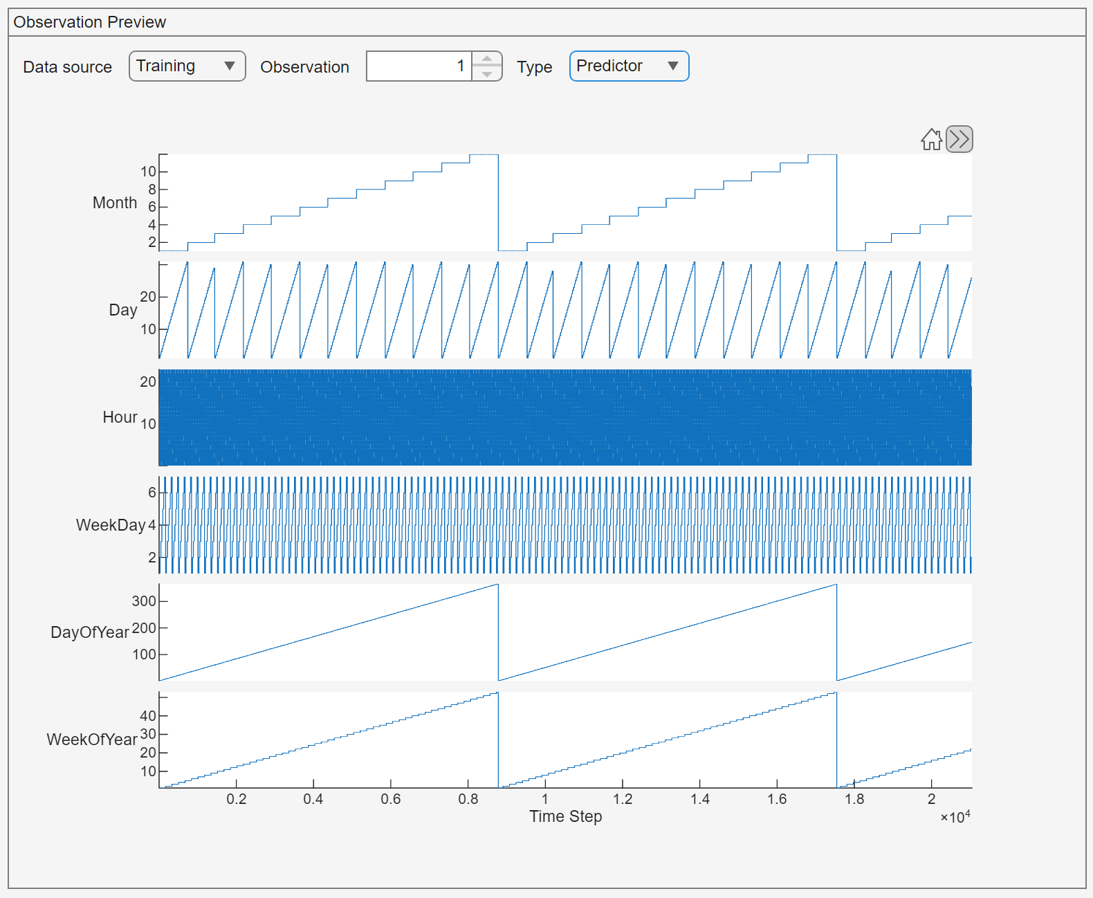 To check that you have imported the intended data, in the Data tab, view the Observation Preview pane. In the Observation Preview pane, set Type to Predictor to observe the periodicity of the temporal predictors.
