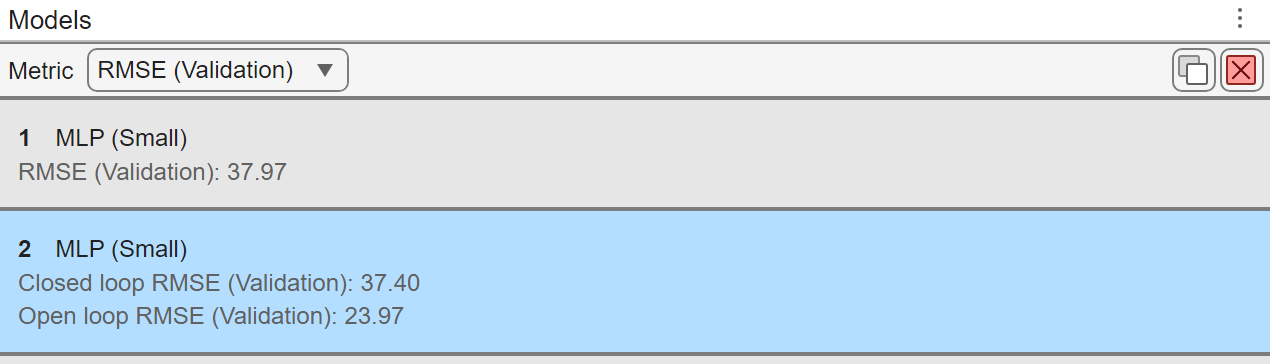 The app reports the root mean squared error (RMSE) for both the closed-loop and open-loop modes. You can view these scores in the Models list at the left of the app. The open-loop RMSE is usually smaller because the ground-truth data continuously corrects the predictions of the model. In the closed-loop mode, errors in the predictions accumulate over time.