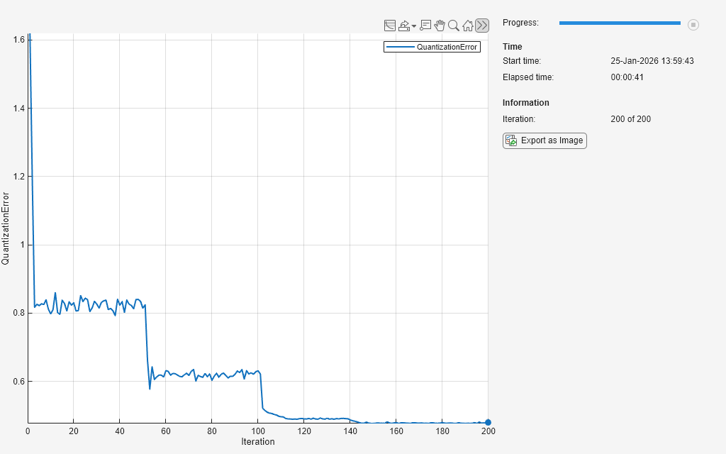 • Update the training progress monitor using the quantizationError function, listed in the Quantization Error Function section of the example.