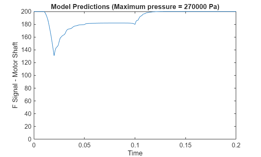 figure plot(simout.simout.Time, Y) ylim([0 inf]) xlabel("Time") ylabel("F Signal - Motor Shaft") title("Model Predictions (Maximum pressure = " + maxPressure + " Pa)")