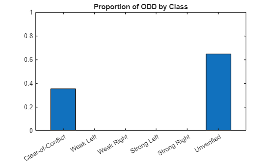figure b = bar([helpers.classNames; "Unverified"],... [classPredictionCount unverifiedCount]/numHypercuboids); ylim([0 1]) title("Proportion of ODD by Class")
