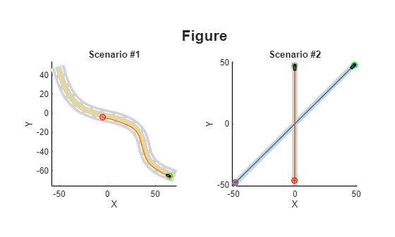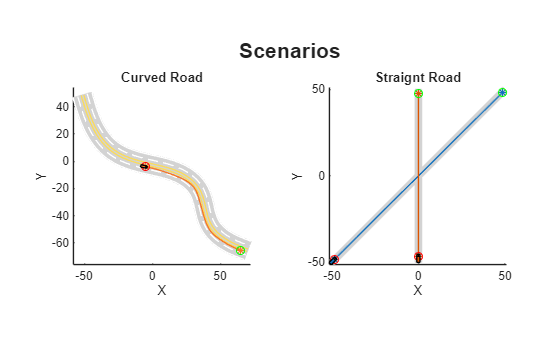 configure(scenarioDescriptorPlotObj,Title="Scenarios",SubPlotTitles=["Curved Road" "Straignt Road"])