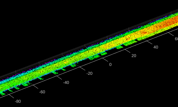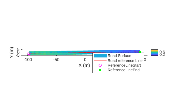 % Specify the width of the road from the reference line. roadWidthFromRefLine = 3.5; % Specify a resolution of 6 cm in the longitudinal and 4.5 cm in the lateral direction. gridResolution = [0.06 0.045]; % Smooth the road reference line to remove any jitters. traj = smooth(traj,Method="sgolay",Degree=3,SmoothingFactor=0.2); % Generate the road surface. rsObj = roadSurface(transformedPointCloud,traj,roadWidthFromRefLine,gridResolution,NormalizeElevation=false,LocalOrigin=localOrigin,ShowProgress=false)