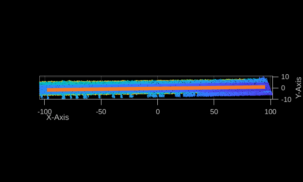 ax = pcshow(transformedPointCloud,ViewPlane="XY"); hold(ax,"on") plot3(ax,traj.Position(:,1),traj.Position(:,2),traj.Position(:,3),LineWidth=5) xlabel(ax,"X-Axis") ylabel(ax,"Y-Axis") hold(ax,"off")