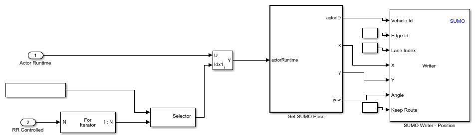 For all SUMO vehicles, the Reader block converts the Actor Id value from RoadRunner to a string scalar, and uses that value to read position, speed, and angle of the corresponding vehicle in the SUMO simulation.. The HelperUpdateRRFromSUMO System object uses the ActorSimulation object to write these values to RoadRunner. Open the Get Vehicle Pose subsystem.