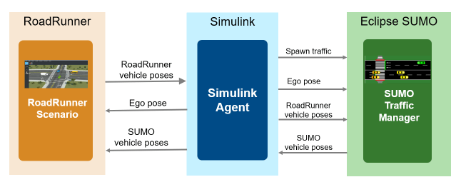 Integrating SUMO with RoadRunner Scenario combines the traffic simulation capabilities of SUMO with the 3D visualization environment of RoadRunner, enabling synchronized traffic flow, coordinated ego vehicle behavior, and realistic automated driving scenario development. This example demonstrates how to use the SUMO traffic simulation blocks from the Automated Driving Toolbox™ Interface for Eclipse SUMO Traffic Simulator support package to perform cosimulation by adding and synchronizing traffic between both SUMO and RoadRunner Scenario simulation platforms, maintaining consistent ego vehicle control, and visualizing real-time interactions between traffic generated in SUMO and RoadRunner.