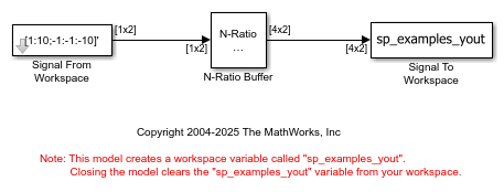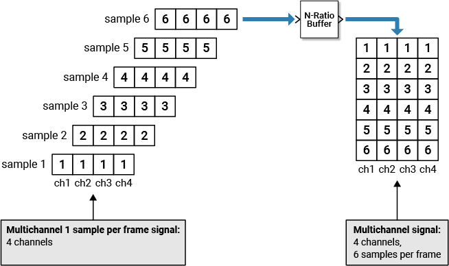 The N-Ratio Buffer block buffers data into blocks of length equal to integer N multiples of the input frame length. The integer ratio N between the output frame length and input frame length is given by the Output-to-input frame length ratio parameter.