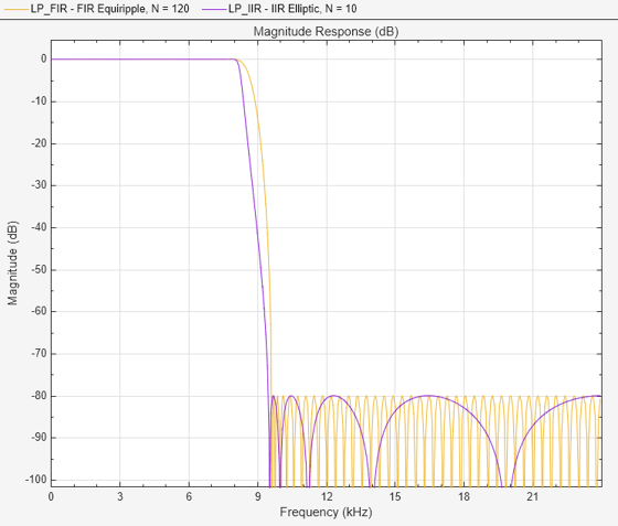 hFiltAnalyzer.addFilters(LP_IIR); hFiltAnalyzer.setLegendStrings(["FIR Equiripple, N = 120" "IIR Elliptic, N = 10"])