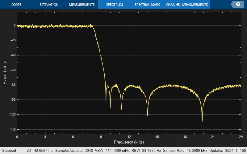 SA_IIR = spectrumAnalyzer(SampleRate=Fs,PlotAsTwoSidedSpectrum=false); tic while toc < 10 x = randn(256,1); y = LP_IIR(x); SA_IIR(y); end release(SA_IIR)