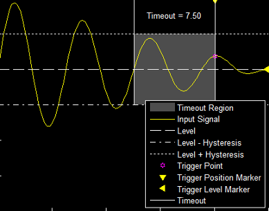 Alternatively, a trigger event can occur when the signal stays within the boundaries defined by the hysteresis for 7.50 seconds after the signal crosses the threshold.