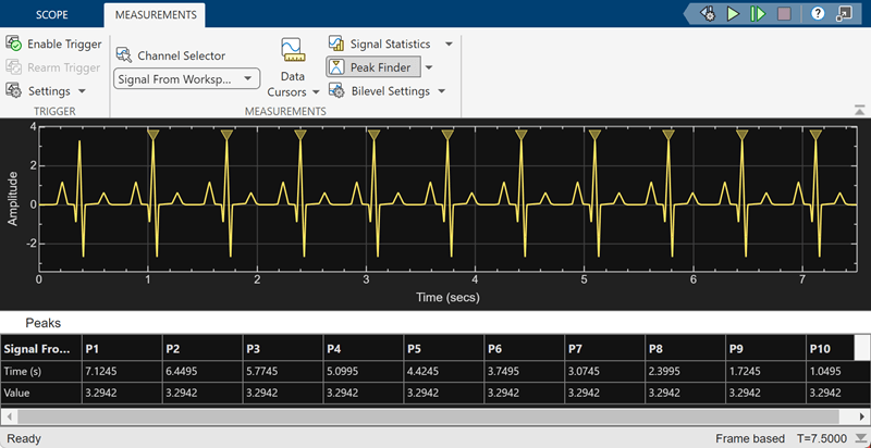 This example shows how to use the Time Scope Peak Finder panel to measure the heart rate from an ECG.
