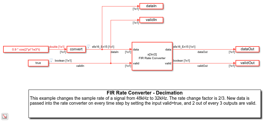 The source is a cosine input signal, sampled at 48kHz. The model passes a new data sample into the block on every time step by holding the input valid port true. After resampling, the output valid signal is true on only 2/3 of the time steps.