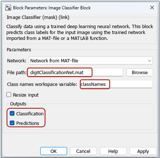 classNames. This variable was created in the Pretrained Digit Classification Network Details section.Select the check boxes for Classification and Predictions to enable output for the class label and the corresponding probabilities.