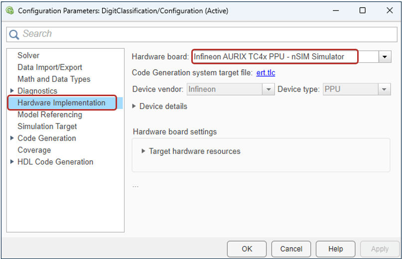 2. In the Hardware Implementation pane, set Hardware board to Infineon AURIX TC4x PPU - nSIM Simulator.