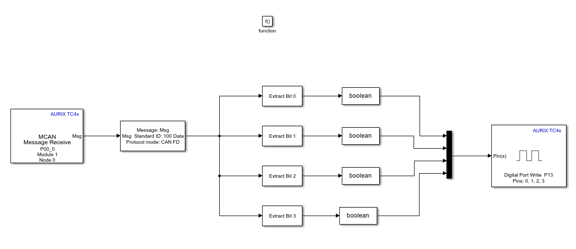 This example shows how to use the MCAN Transmit and Receive blocks from Embedded Coder® Support Package for Infineon® AURIX™ TC4x Microcontrollers to handle interrupt-based communication between different CAN modules of Infineon® AURIX™ TC4x Microcontrollers.
