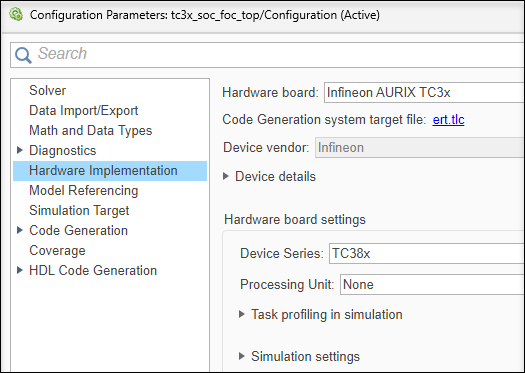 3. In the Hardware Implementation pane, set Hardware board to Infineon AURIX™ TC3x, Device Series to TC38x, and Processing Unit to None.